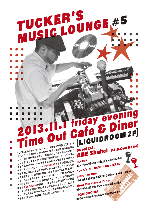 “エレクトーン”を武器に即興性を掛け合わせ、リズムボックスやギター、ベース等をたった一人で駆使するオリジナルスタイル、パフォーマー=TUCKERが自身の音楽人生に影響をおよぼした楽曲を中心に、しっとりエレクトーンを奏でる金曜の夕べ。五回目の開催となる今回のゲストDJにはデザインユニット「イルドーザー」~DJユニット「JAYPEG」をへて非営利インターネット放送局「ヴィンセント・ラジオ」を主宰するABE Shuheiが登場! 会社帰りや深夜遊びへの助走として、飲食と歓談の席にゆるやかに広がるオリジナルスタイリンな二人によるグッドミュージックをお楽しみください。入場無料(最初の一杯目は1,000円)。お気軽にっ!