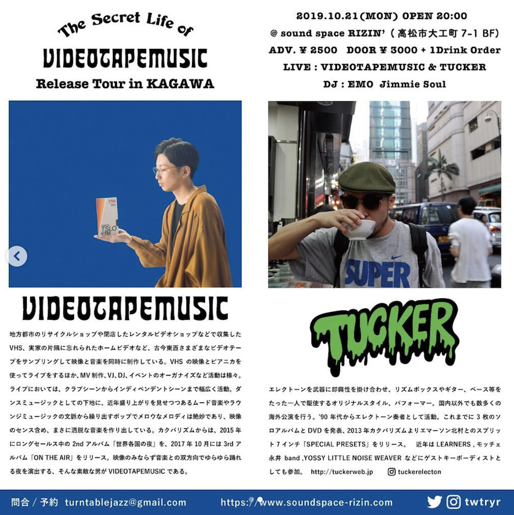 “The Secret Life of VIDEOTAPEMUSIC” Release Tour in KAGAWA日時:2019.10.21(月・祝日前) OPEN 20:00場所:soundspace RIZIN’(高松市大工町7-1 B1)料金:前売り2,500円 当日3,000円(共に別途ドリンク代500円)LIVE:VIDEOTAPEMUSIC , TUCKERDJ:EMO , Jimmie Soul