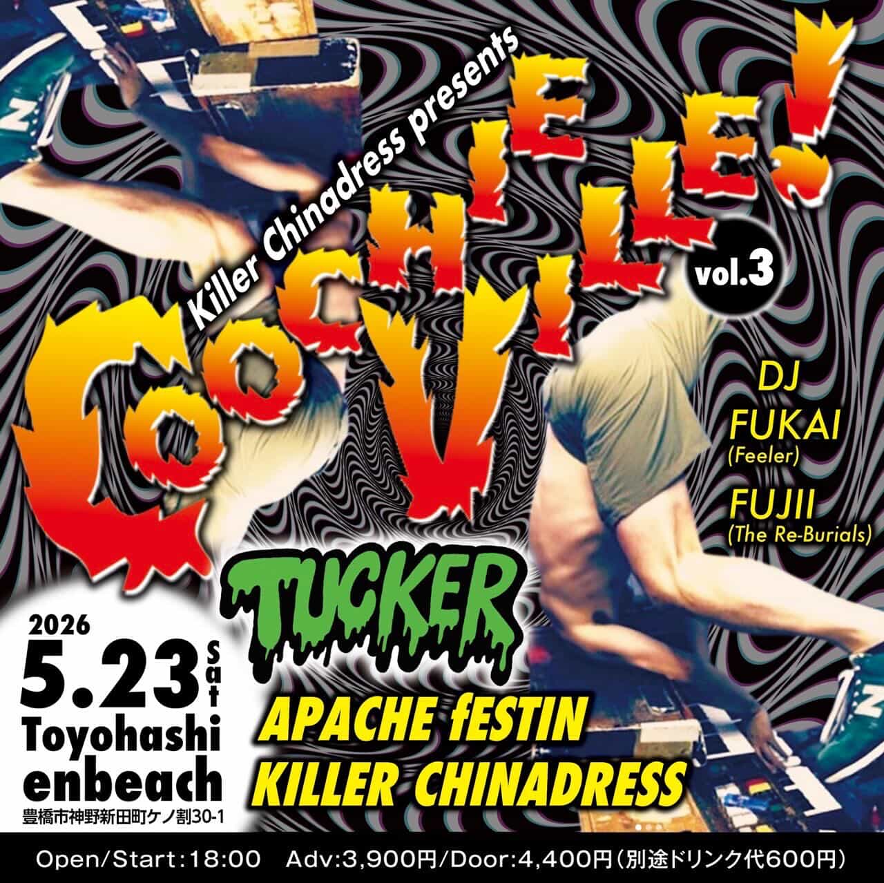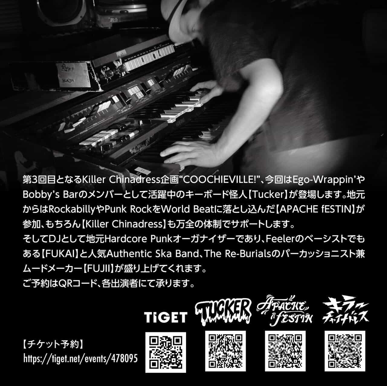 第3回目となるKiller Chinadress企画”COOCHIEVILLE”、今回はEgo-Wrappin’やBobby’s Barのメンバーとして活躍中のキーボード怪人【Tucker】が登場します。地元からはRockabillyやPunk RockをWorld Beatに落とし込んだ【APACHE fESTIN】